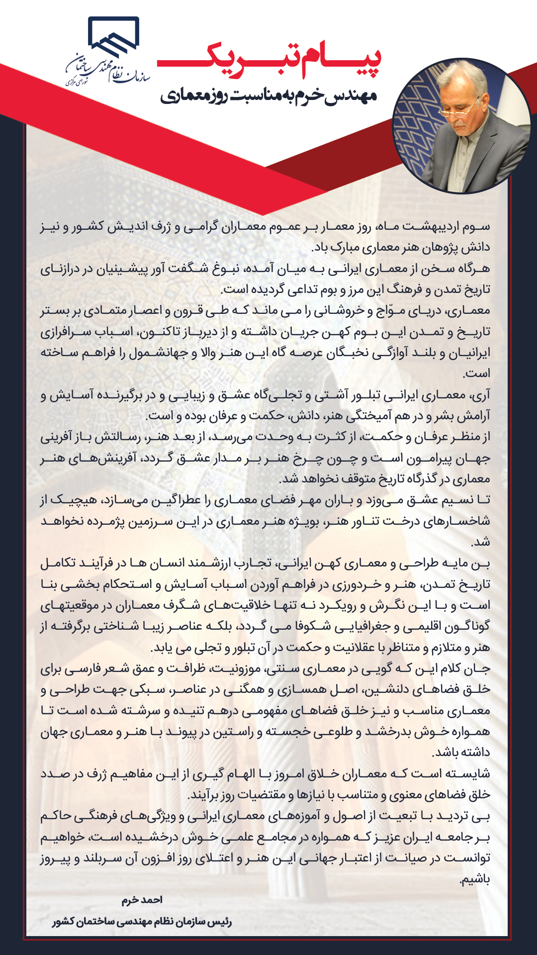 به گزارش روابط عمومی سازمان، مهندس احمد خرم، رئیس سازمان نظام مهندسی ساختمان کشور به مناسبت سوم اردیبهشت ماه، روز معماری پیام تبریکی به شرح ذیل صادر کرد: