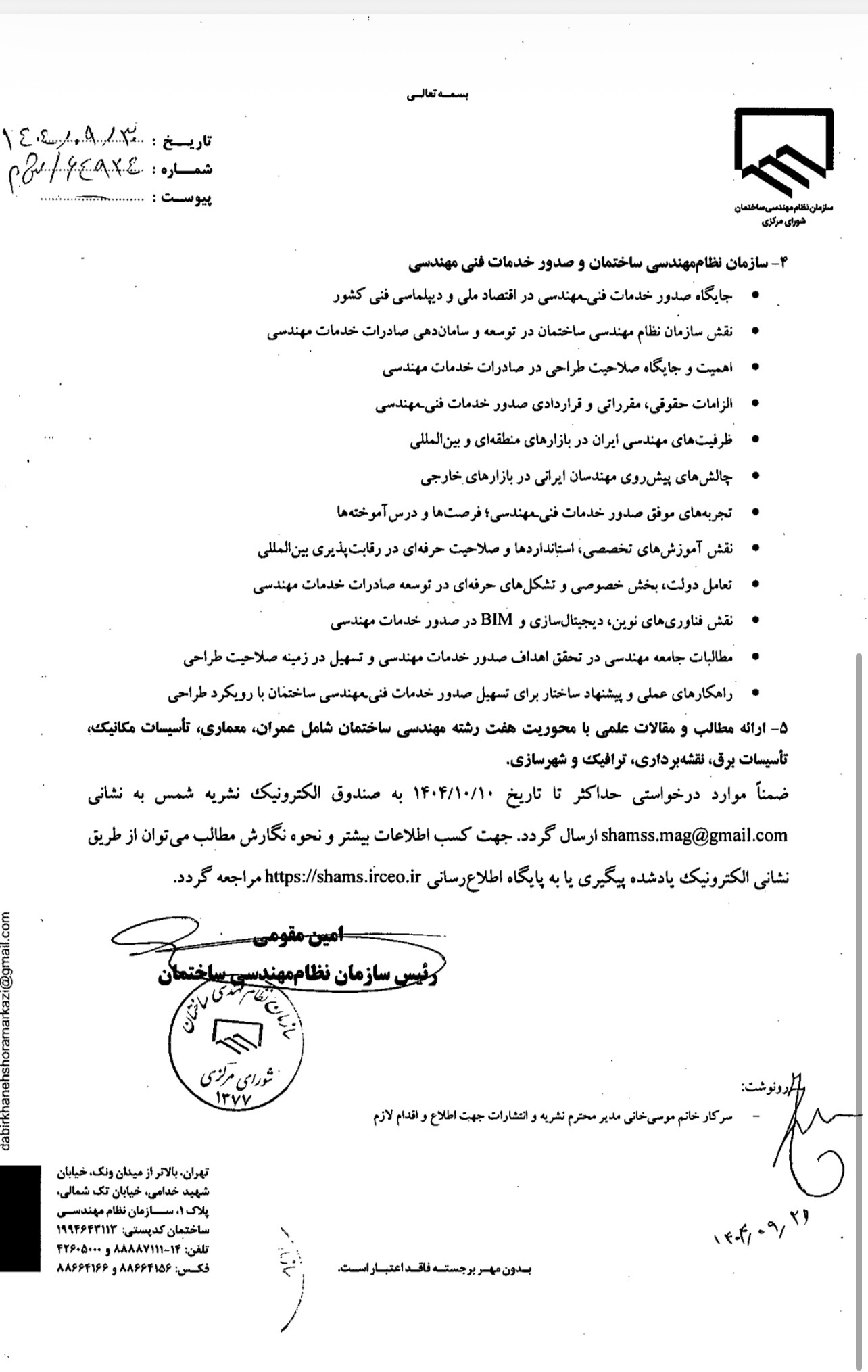 مشارکت فعال جامعه مهندسی، نقش مؤثری در ارتقای محتوای علمی و تخصصی نشریه شمس خواهد داشت.