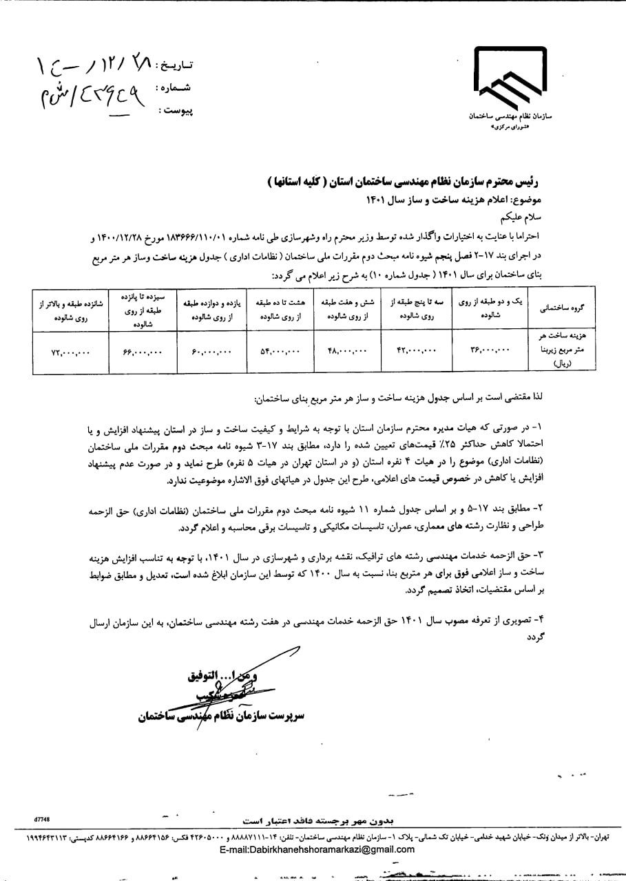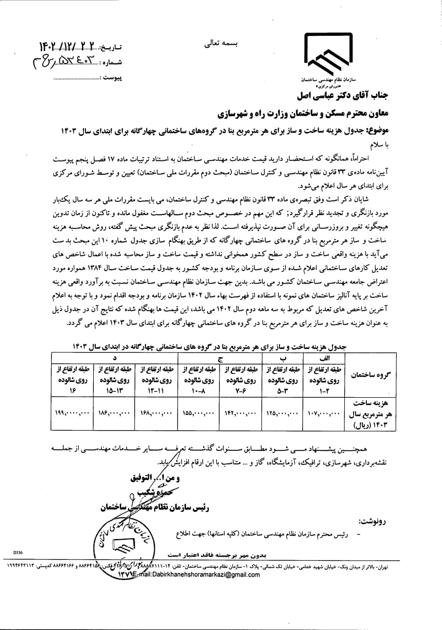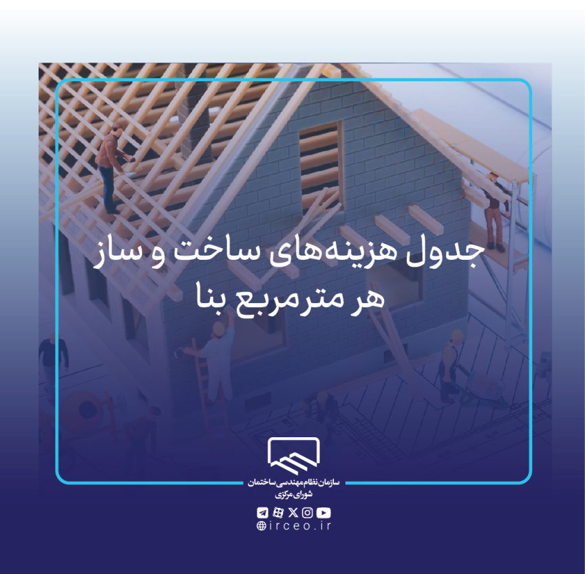جدول هزینه‌های ساخت و ساز هرمتر مربع بنا(۱۳۹۹ـ۱۴۰۴)