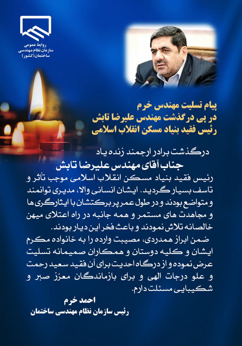 به گزارش روابط عمومی سازمان، مهندس احمد خرم، رئیس سازمان نظام مهندسی ساختمان در پیامی، درگذشت مهندس علیرضا تابش، رئیس فقید بنیاد مسکن انقلاب اسلامی بر اثر ابتلا به بیماری کرونا را تسلیت گفت.