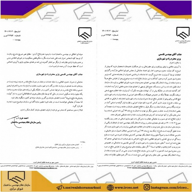 از قرار اطلاع، نامه ای منسوب به جنابعالی خطاب به مدیرکل راه و شهرسازی استانی در عصر روز یکشنبه مورخ 03/07/1400 در فضای مجازی منتشر و پروانه اشتغال بکار مهندسی احد از داوطلبان یکی از سازمان های استان ها به دلیل عدم توجه به ابلاغیه ها و اطلاعیه های قانونی وزارت راه و شهرسازی بدون ذکر مدت تعلیق گردیده است، فارغ از اینکه بند ج ماده 23 آیین نامه اجرایی خلاف اصول مسلم حقوقی و دادرسی عادلانه است و اصولاً تعلیق پروانه اشتغال بکار مهندسی که نوعی مجازات شمرده می شود، مستلزم رسیدگی در مرجع قضایی یا شورای انتظامی با حق دفاع و اعتراض به رای صادره است، ابهامی جدی که مطرح شده این است: "منظور مدیران محترم راه و شهرسازی در گزارشی تقدیمی به جنابعالی در خصوص عدم توجه به کدام ابلاغیه و اطلاعیه است؟ " اگر منظور بخشنامه های موضوع پرهیز از تعارض منافع در دوره وزیر محترم اسبق است که هنوز و تا کنون به این سازمان ابلاغ نشده است و حتی در آن نیز عدم استفاده از پروانه اشتغال بکار مهندسی بطور مطلق برای هیچ کس منع نشده است، اگر هم منظور نظام نامه رفتار حرفه ای اخلاقی در مهندسی ساختمان است- با وجود عدم ابلاغ آن نیز- مطابق نص صریح مندرج، رعایت آن توسط کلیه اشخاص احراز شده تلقی شده است، مگر به حکم قطعی محکومیت در شورای انتظامی مبنی بر عدم رعایت ارادی نظام نامه. از دیگر سو انتشار گسترده این نامه در فضای مجازی، بازی با آبروی اشخاص است که حفظ حرمت آن بر همه ما واجب است .