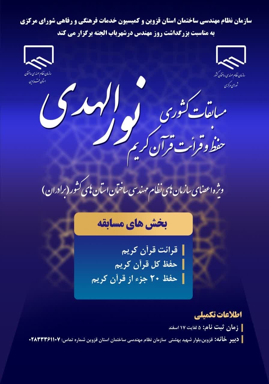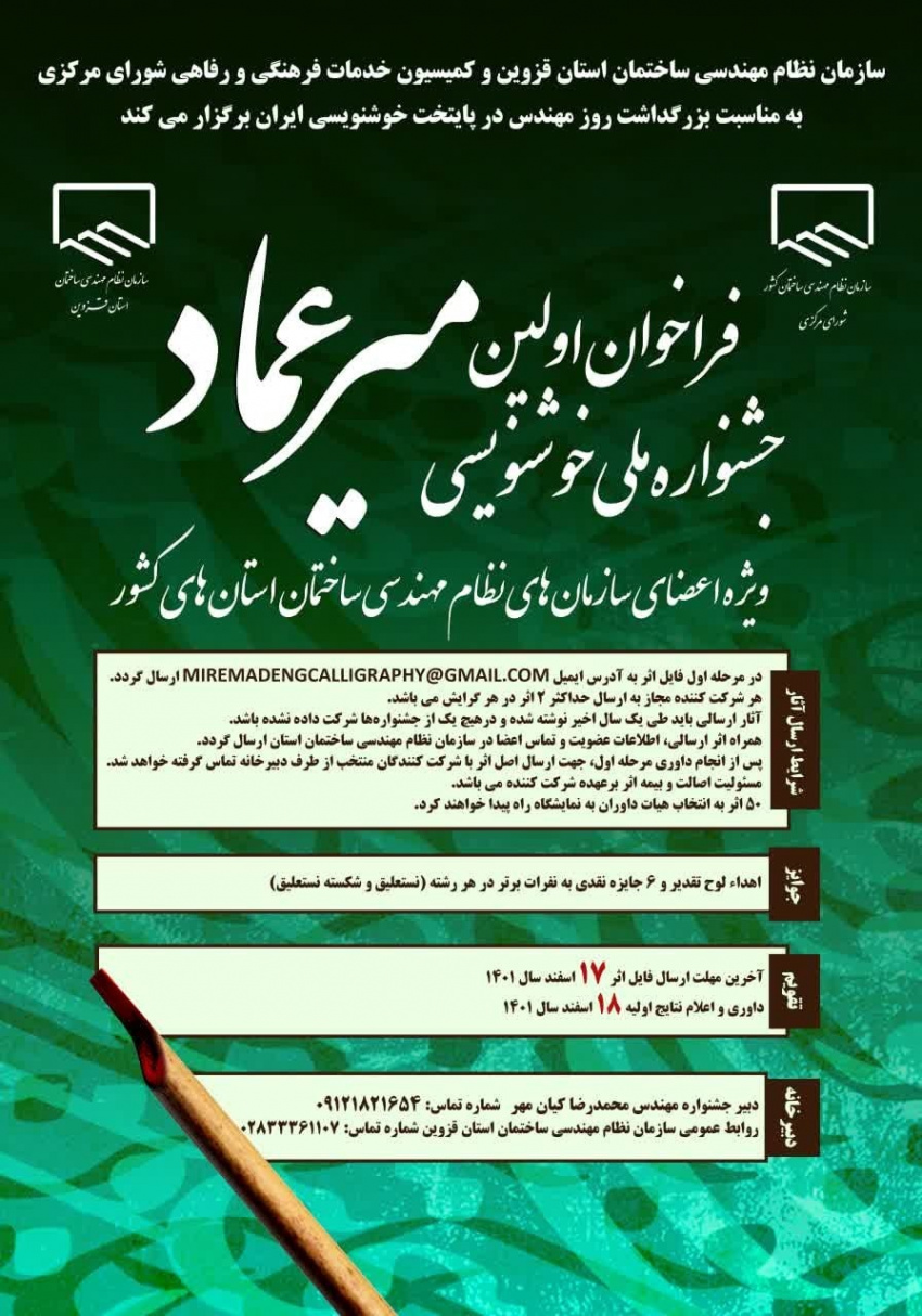 بمناسبت روز مهندس؛ برگزاری اولین جشنواره ملی خوشنویسی با همکاری کمیسیون بیمه، مالیات و خدمات رفاهی شورای مرکزی و سازمان نظام مهندسی ساختمان استان قزوین