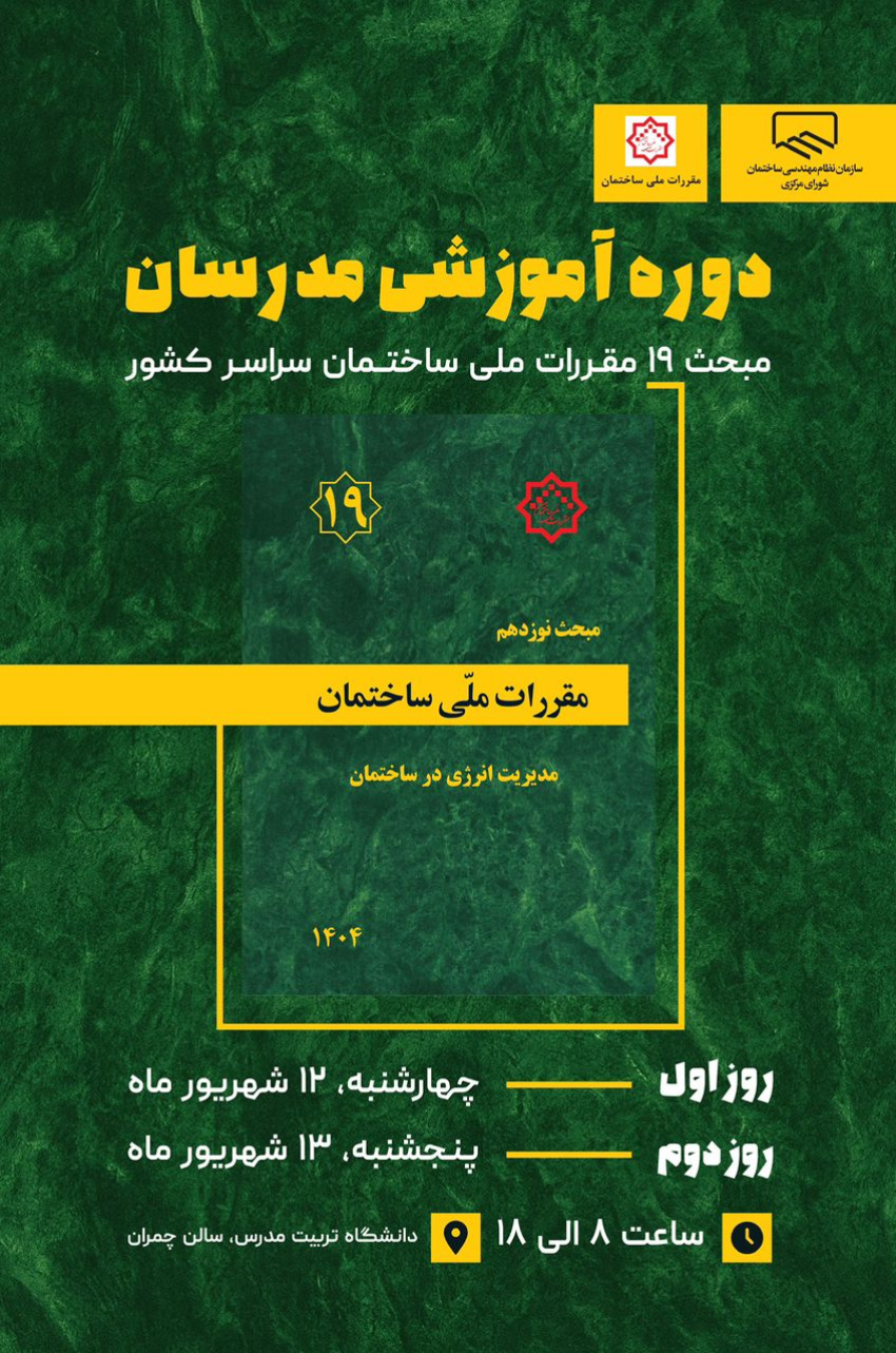 دوره آموزشی مدرسان مبحث ۱۹ مقررات ملی ساختمان (مدیریت انرژی در ساختمان) از سوی سازمان نظام مهندسی ساختمان کشور و با همکاری دفتر مقررات ملی ساختمان برگزار می‌شود