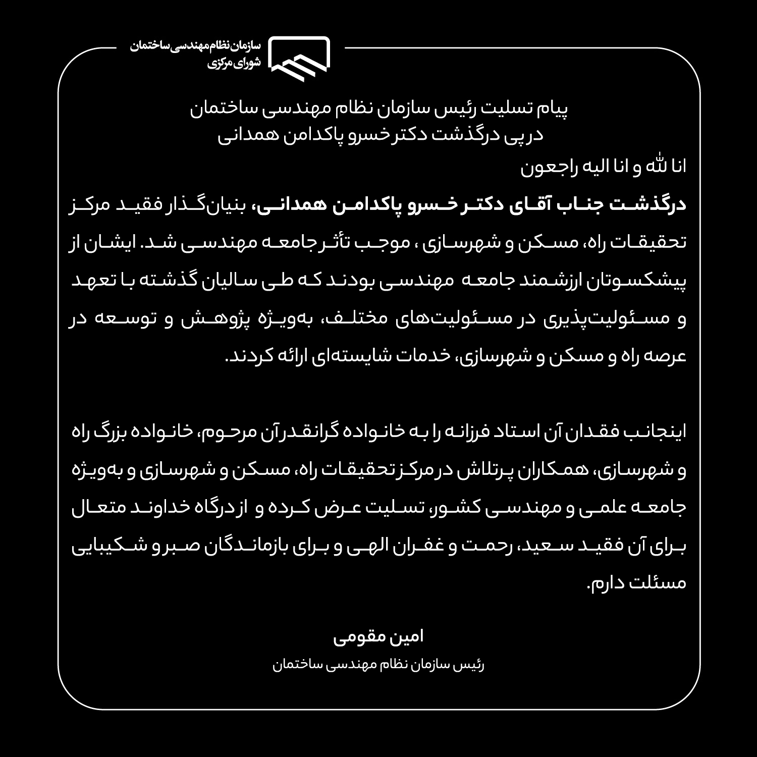درگذشت جناب آقای دکتر خسرو پاکدامن همدانی، بنیانگذار فقید مرکز تحقیقات راه، مسکن و شهرسازی ، موجب تأثر جامعه مهندسی شد. ایشان از پیشکسوتان ارزشمند جامعه مهندسی بودند که طی سالیان گذشته با تعهد و مسئولیتپذیری در مسئولیتهای مختلف، بهویژه پژوهش و توسعه در عرصه راه و مسکن و شهرسازی، خدمات شایستهای ارائه کردند. اینجانب فقدان آن استاد فرزانه را به خانواده گرانقدر آن مرحوم، خانواده بزرگ راه و شهرسازی، همکاران پرتلاش در مرکز تحقیقات راه، مسکن و شهرسازی و بهویژه جامعه علمی و مهندسی کشور، تسلیت عرض کرده و از درگاه خداوند متعال برای آن فقید سعید، رحمت و غفران الهی و برای بازماندگان صبر و شکیبایی مسئلت دارم.