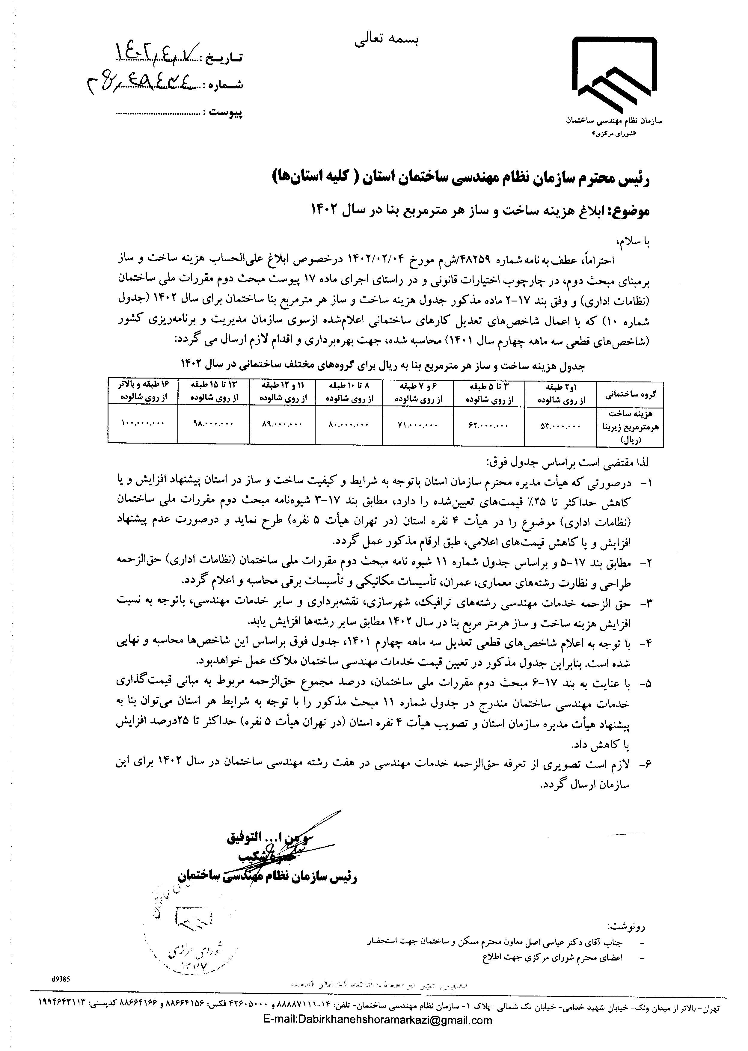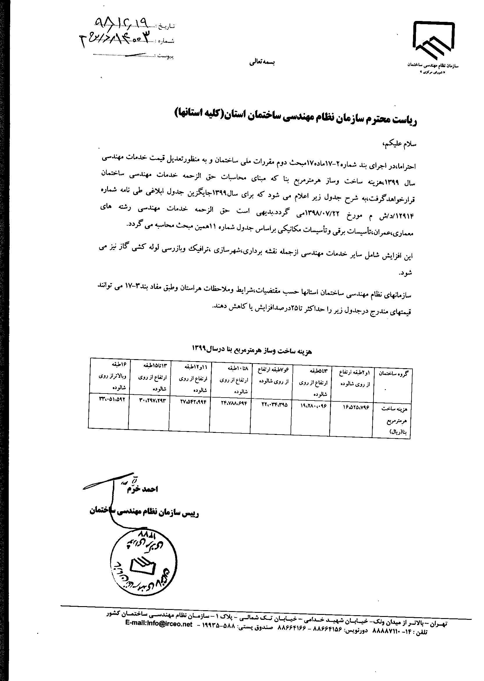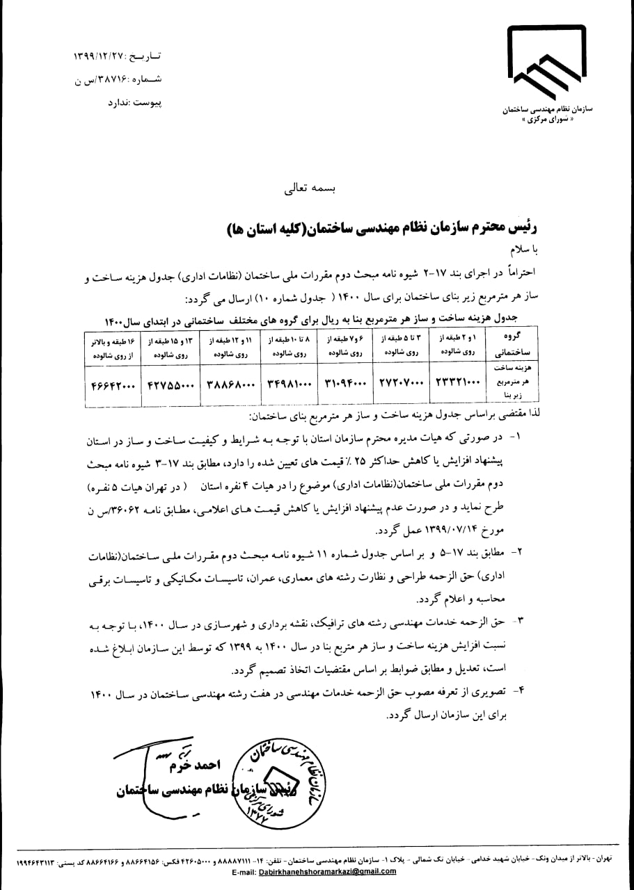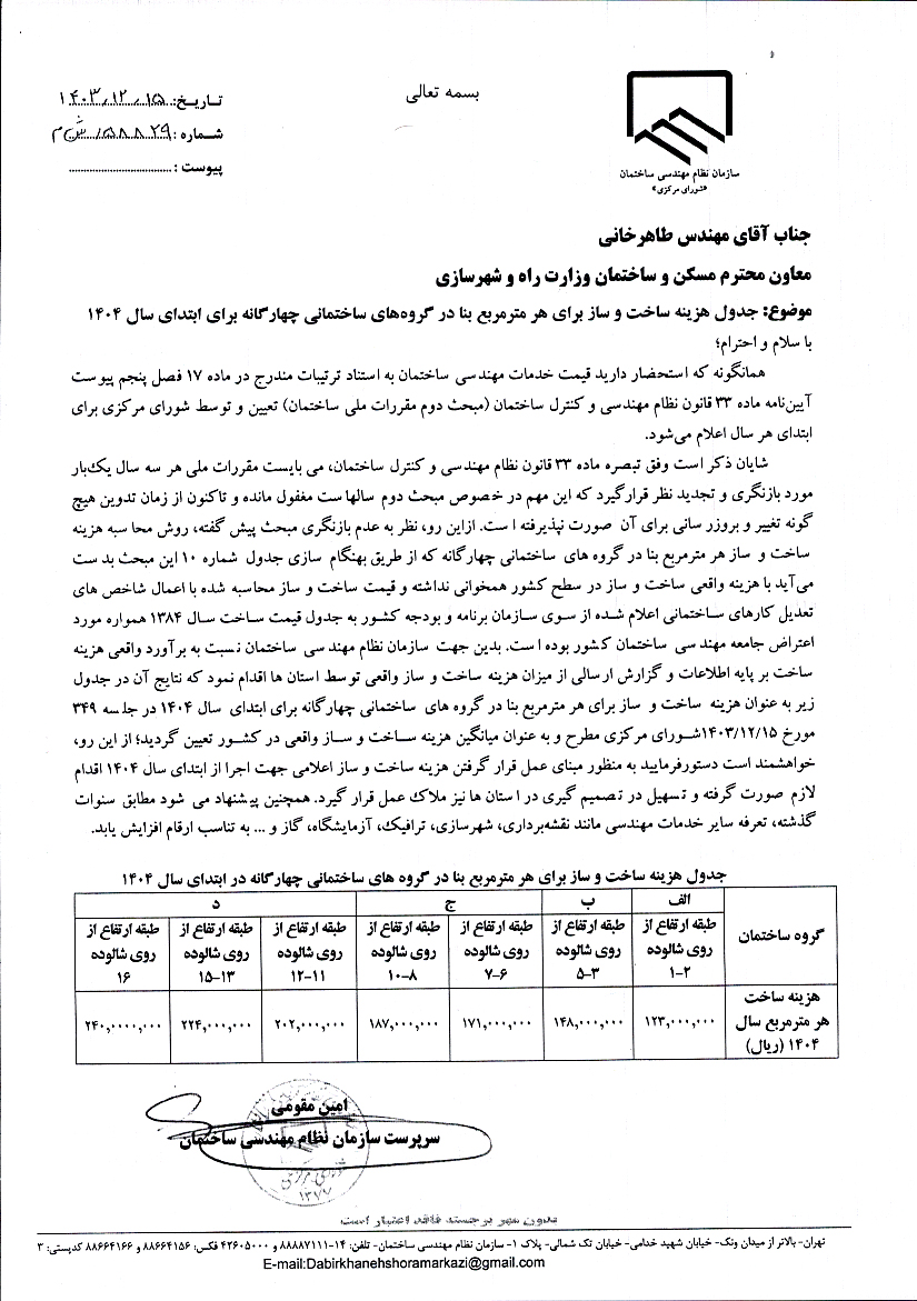 جدول هزینه‌های ساخت و ساز هرمتر مربع بنا(۱۳۹۹ـ۱۴۰۴)